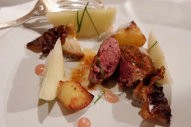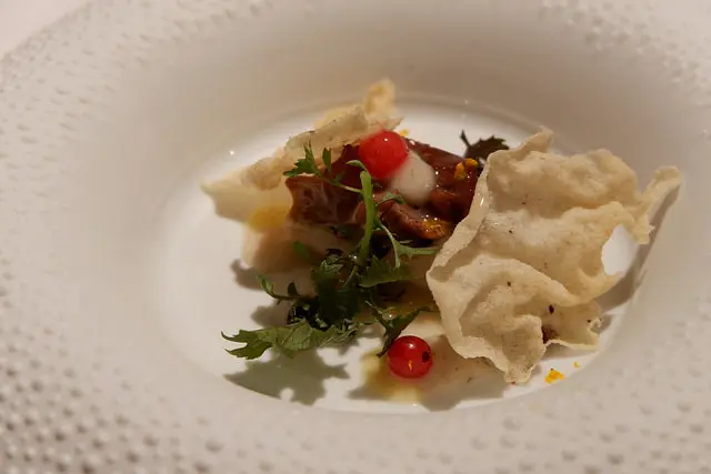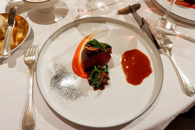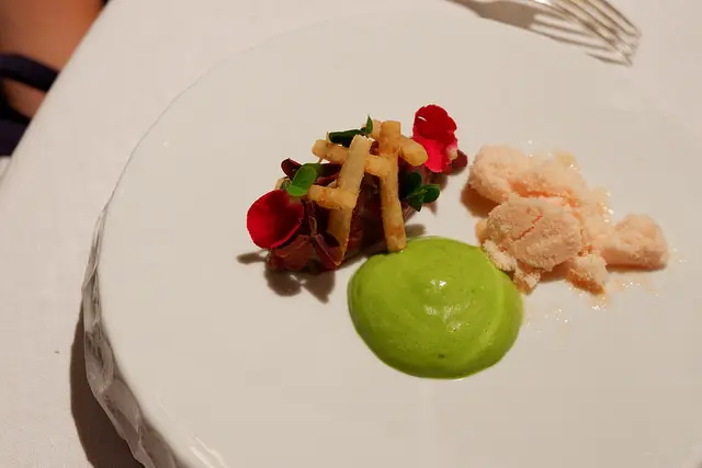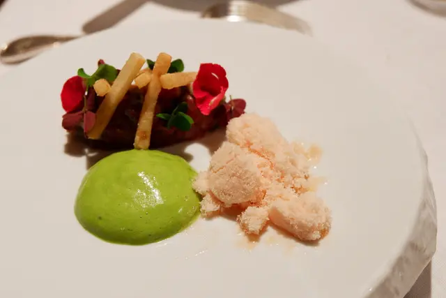 牛肉成的塔塔搭配諾曼第生蠔、薯條與玫瑰,不說會以為是甜點對吧^^
