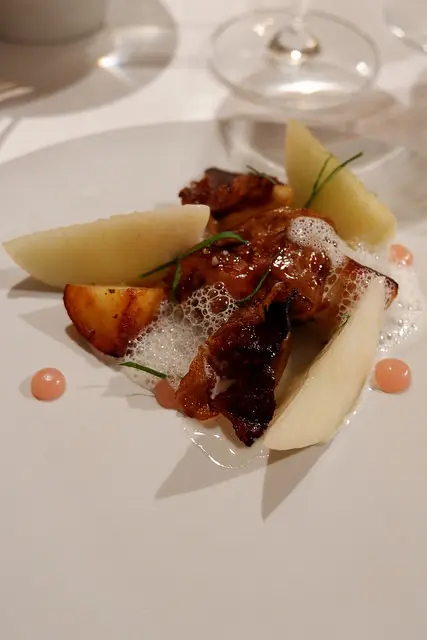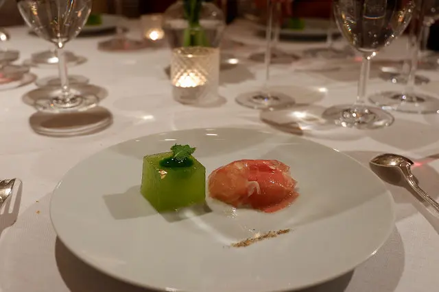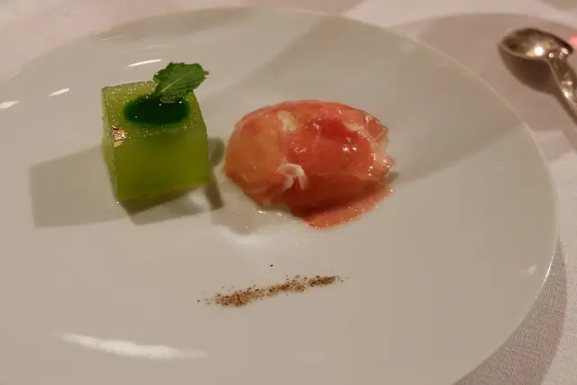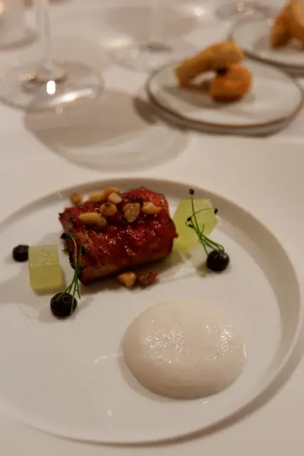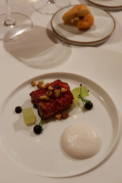 台灣白鰻魚搭配自製的紅糟,山椒拌炒的松子搭配哈密瓜與山藥慕斯,松子好香唷!