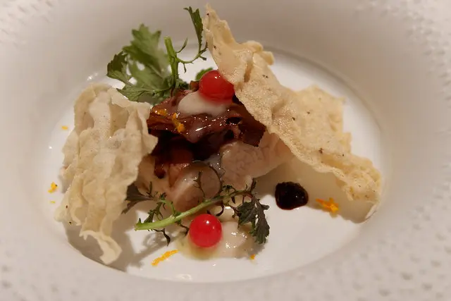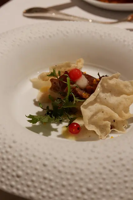 豬肉松坂搭配薏仁脆片,我的這一道套餐每一款都有各種不一樣的煙燻風味,這道是煙燻的豬骨汁,有點甜香