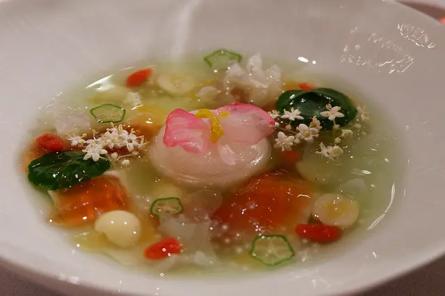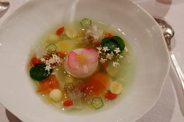 茉莉綠茶湯做甜湯,接骨木花冰沙、冬瓜凍、西米露,豆花、白木耳、蓮子、枸杞、秋海棠、接骨木花、金蓮花葉片,很像中式甜湯的甜品,美的像是一幅莫內的名畫