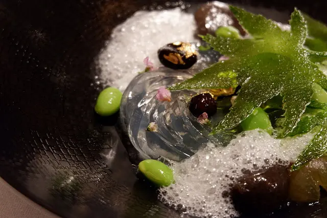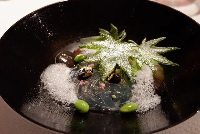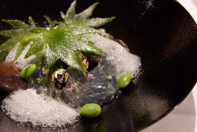 腐爛的草之後會變成螢火蟲,黑豆上的金箔代表螢火蟲,果凍麵條代表流水,黑芝麻做成岩石,流水撞擊的泡泡就成了柚子泡泡,還有紫蘇冰沙,屬於六月美麗中帶點哀傷的甜點