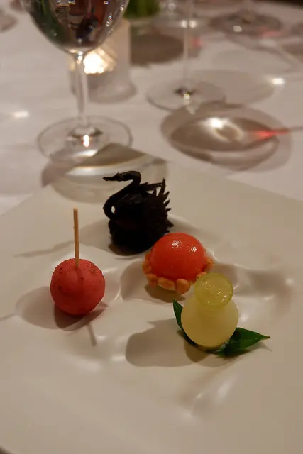 貝里尼做成的微醺甜點、天鵝巧克力泡芙和紅心芭樂做成的蛋糕,每一口都很精緻