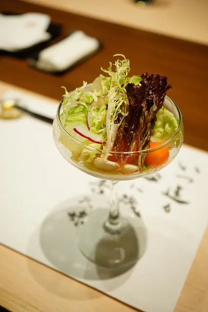 將糖煮過後的紅蘿蔔、白蘿蔔挖成可愛的小球球,鬆軟可口,還有鬆脆的山藥與各種生菜,佐以日式風味的柚子油醋醬,甜中帶酸相當開胃