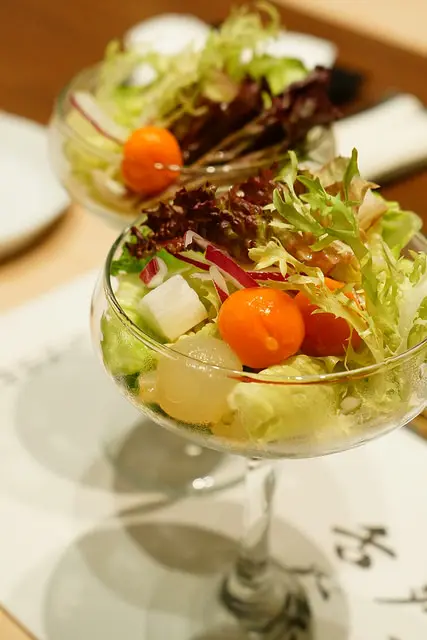 雖然說是吃到飽但一點也不馬虎,沙拉、前菜、飯後甜點,一整套的套餐附餐都還是有的,這是和風沙拉佐柚子油醋醬