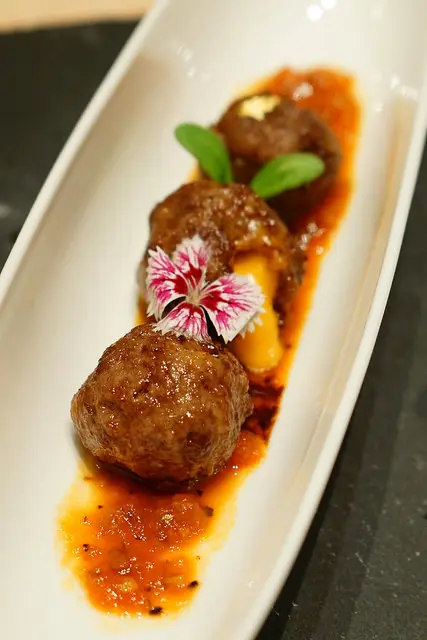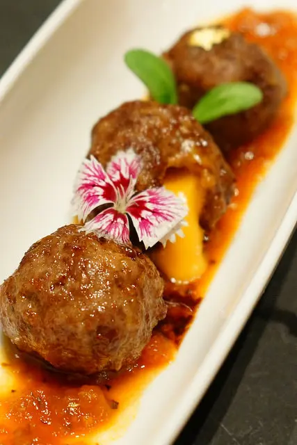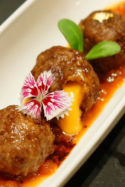 從原味、爆漿起司、松露這樣的順序來吃,原味奢華的點綴上金箔,最愛爆漿的起司流淌出來的感覺,牛肉丸子感覺手工打的,吃起來很有彈性