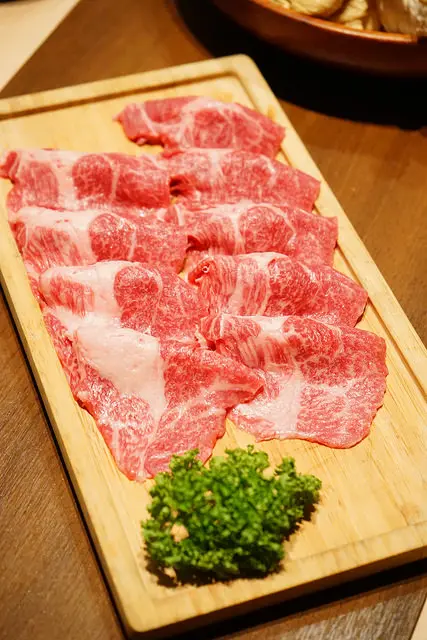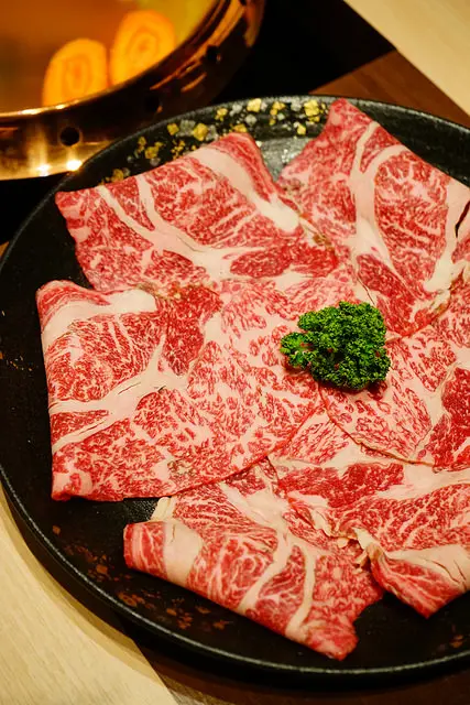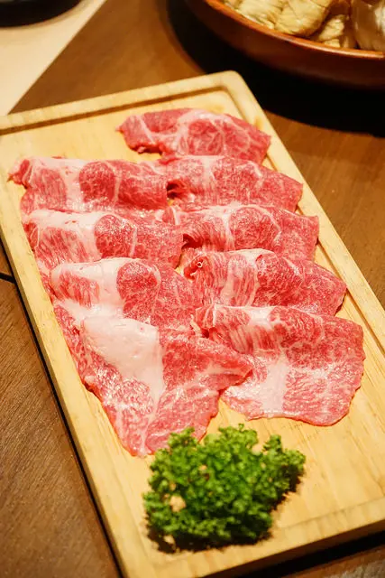 澳洲純種9+和牛牛肩卷,取自於牛肩胛部位,中間夾有細筋,口感厚實卻也有著彈性,細筋煮熟後脆脆的口感也很特別,和牛特有的香甜油花讓肉質更加分