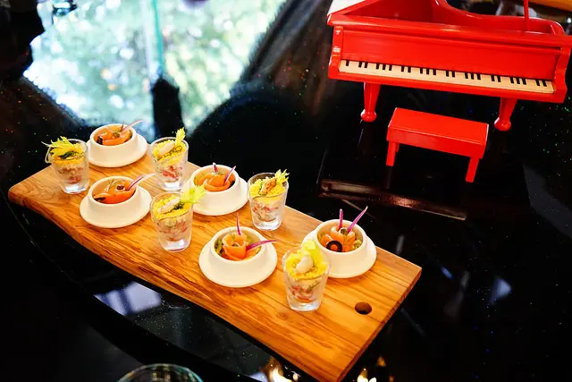 首先華麗上菜的是自製燻鮭魚搭香蔥鮪魚蟹肉塔,雖說是辦桌,但菜色的擺盤卻有著西餐的浪漫,這道開胃菜讓大家眼睛為之一亮,大家都紛紛拿出手機來拍照