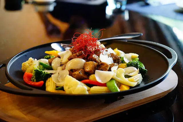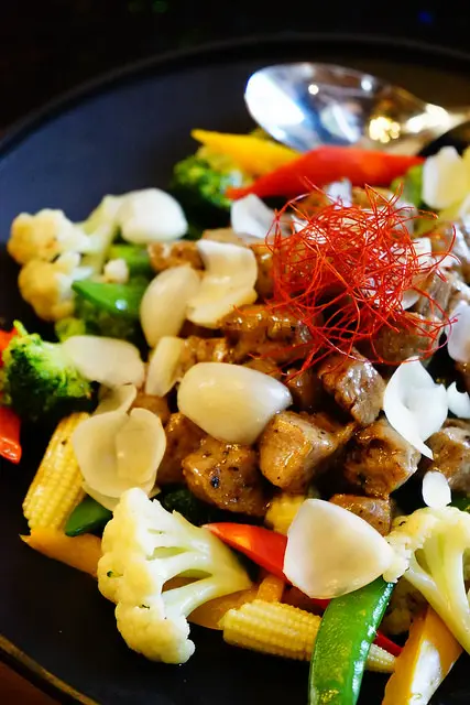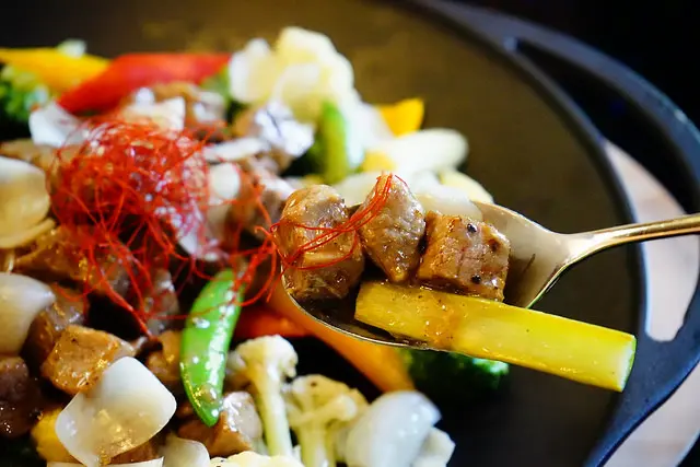 嫩到不行的骰子牛搭配各式各樣的當令蔬菜,百合脆脆的口感真爽口