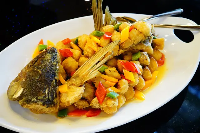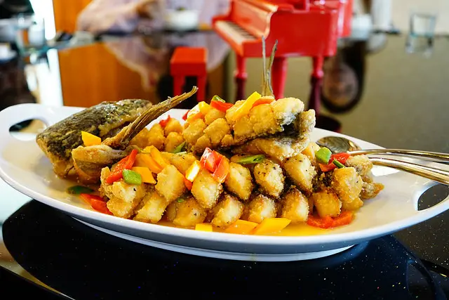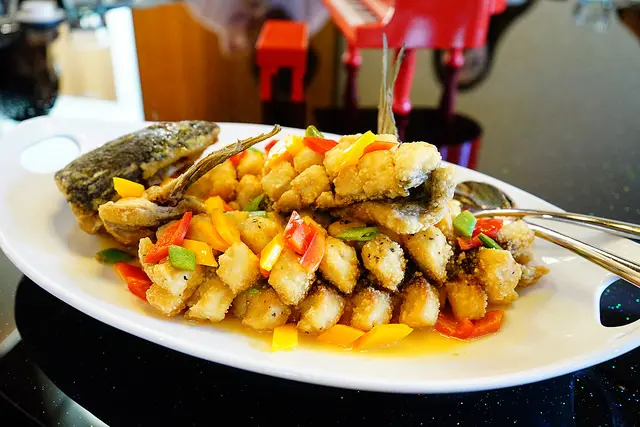 平常對於魚興趣缺缺的我卻對於用油炸方式的魚料理特別喜歡,尤其像這樣用水果入菜充滿酸甜果香的魚我很可以,炸的外酥內嫩的魚一口拌入酸甜迷人的醬汁,超開胃