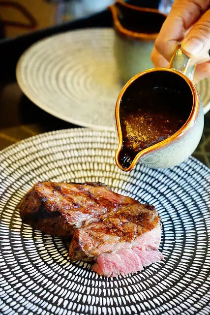 但我覺得這塊品質很好的烤牛肉不須淋醬吃他的原味就很香甜多汁了,剛一拿出來時是烤的五分熟的熟度,我覺得最鮮嫩可口,因為家人有些人不敢吃太生所以又送回廚房回烤,大概烤成七分熟,七分熟我就覺得太老了,還是依剛開始的五分熟度我最喜歡,不必擔心是你不愛的熟度,因為可以依你們自己想吃的熟度再幫你們送回廚房調整,但我建議五分熟的熟度是最最好吃的了