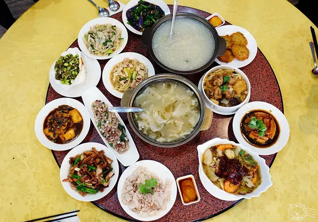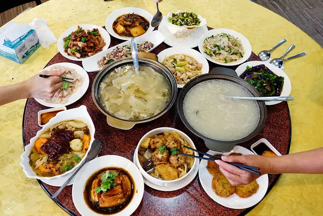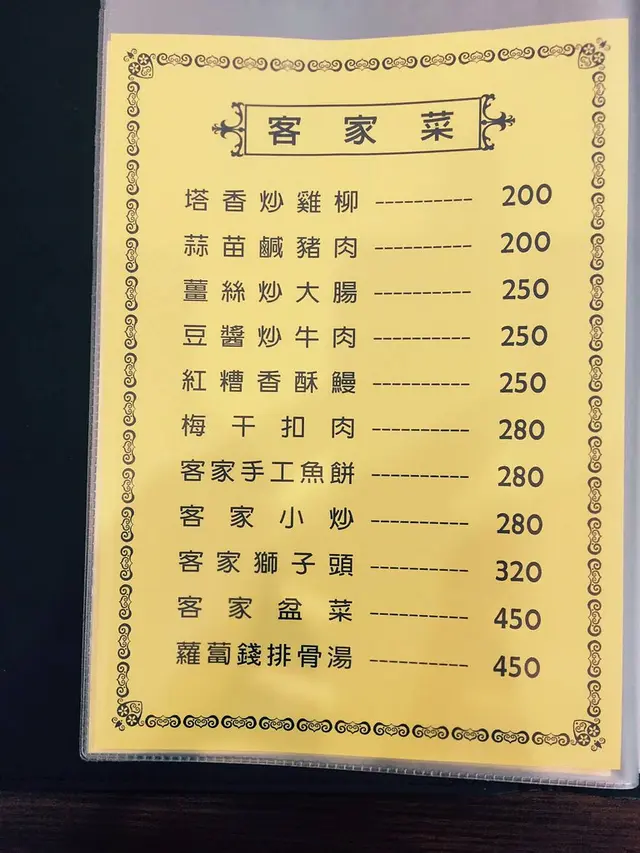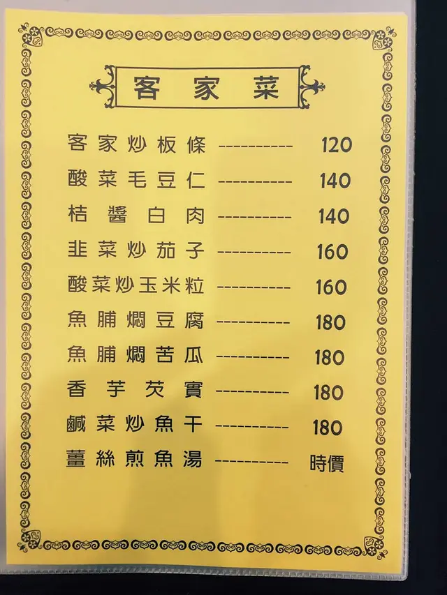 客家獅子頭、香芋芡實、客家盆菜、薑絲炒大腸、客家炒粄條、韭菜炒茄子、酸菜仁毛豆、薑絲煎魚湯