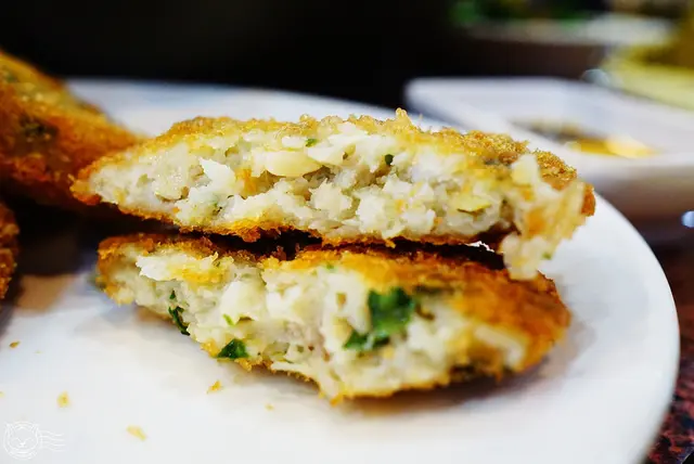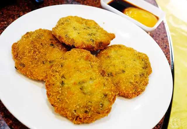 師傅手工剃除草魚的肉製成的魚餅,裡面加了香菜和荸薺提升口感和香氣,