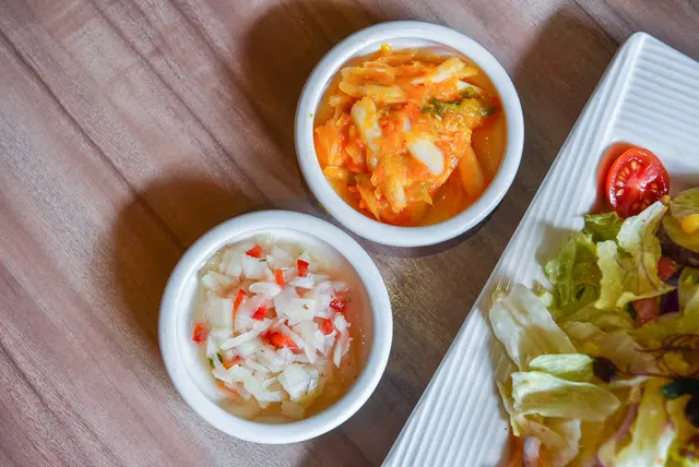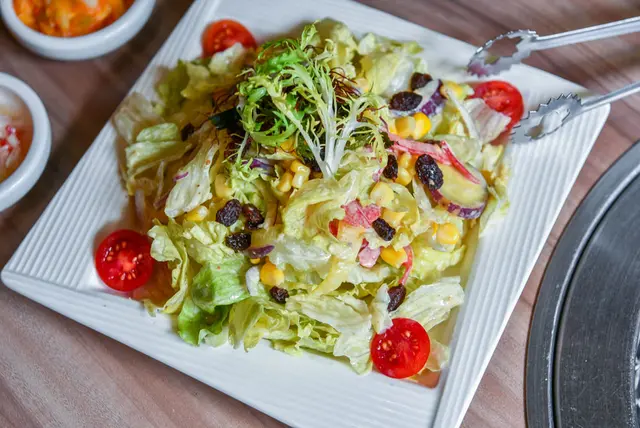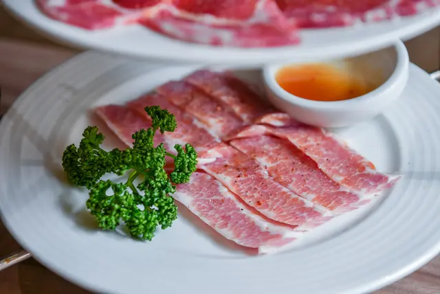 梅花豬不會切得太薄,油花也不會覺得太多,包著洋蔥丁、泡菜與生菜一起吃的口感超涮嘴讓人吃到停不下來 😎