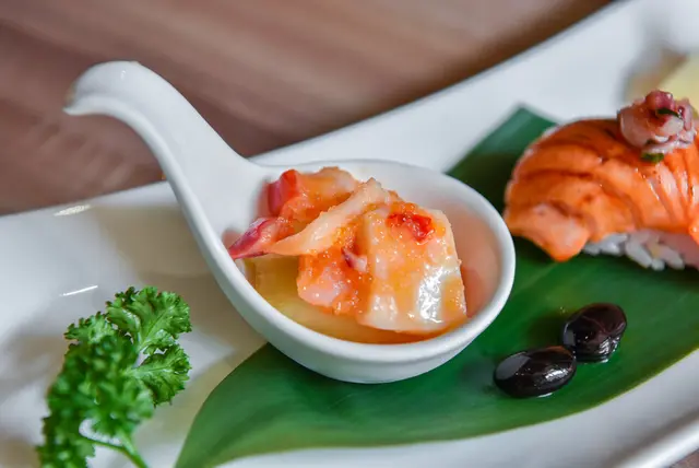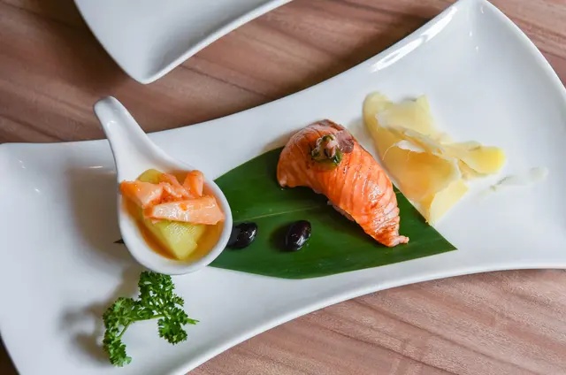 取自鮭魚腹的炙燒壽司,魚片厚實且含有油質完全沒有魚腥味,油質的滑嫩程度我覺得剛剛好,搭配上頭的芥末章魚口味滿豐富的。