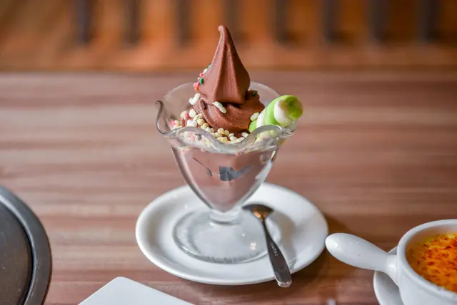 巧克力冰淇淋撒上一些糖果及米果增加口感,口味上不會太甜,表現中規中矩。