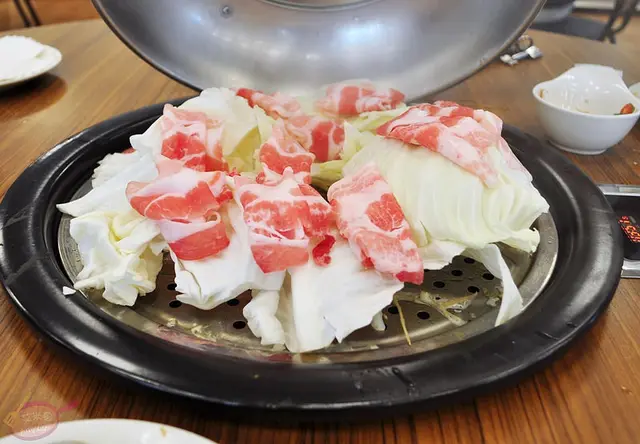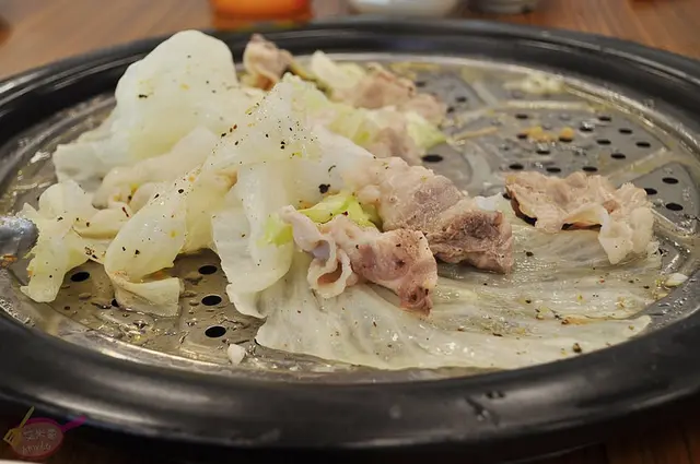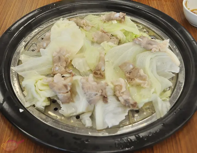 大大片高麗菜葉舖底,上置五花肉片,蒸汽個4分鐘就好了