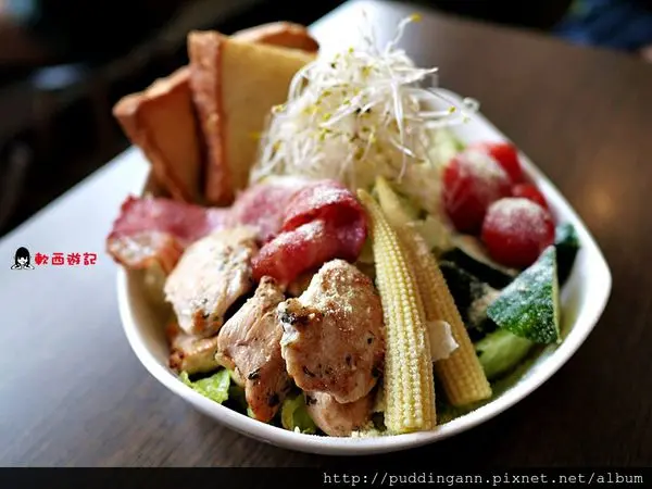 只能說這一大盤好豐盛阿XD雞肉軟嫩,配上鮮甜清脆玉米筍,還有培根、法式吐司等等