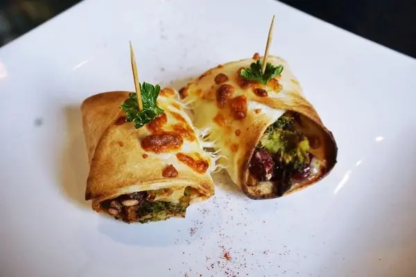 餅皮吃起來像是薄皮比薩的口感 加了起司吃了還會牽絲