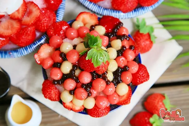 小湯圓超Q吃起來也好甜蜜,拍起來畫面性更是豐富,而這次的草莓大小適中,吃起來甜度也算高,如果有朋友怕酸,店家也會提供煉乳添加喔。