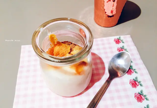 套餐有另外附上牛奶、果汁、優格擇一,我們選了優格!上層有玉米片及黑糖粉唷