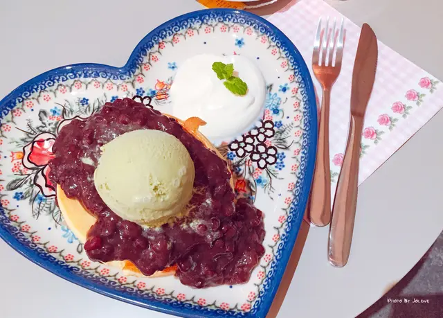 紅豆抹茶冰淇淋鬆餅,完全不會太甜膩,就連旁邊的奶泡鮮奶油,也是很棉唷
