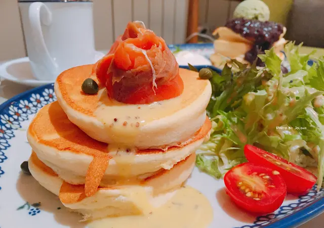 挪威鮭魚酸豆,鹹舒芙蕾厚鬆餅;單點$200元、套餐$320元