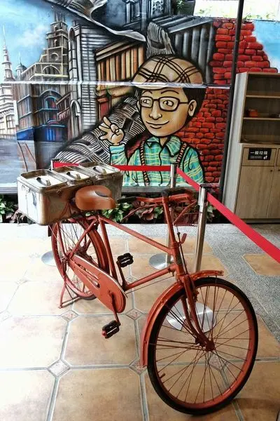 一進門擺放在庭院裡的老舊單車及人力拉車,