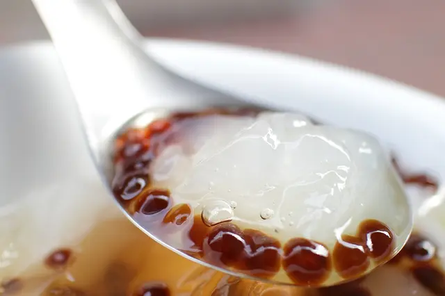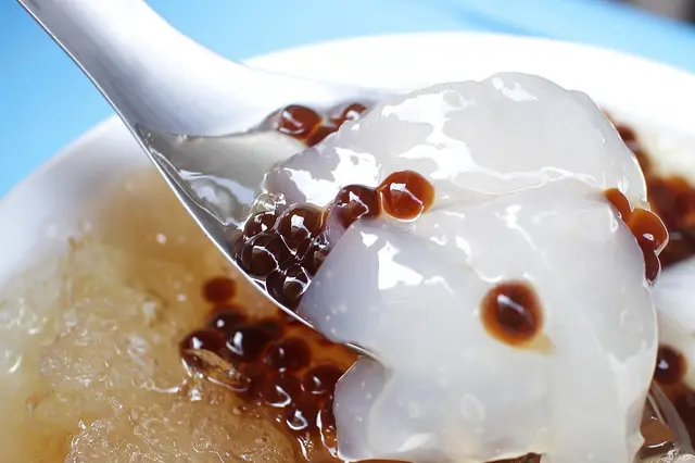 再來口白色的粉粿及珍珠,粉粿塊狀和珍珠一顆顆的Q彈口感交錯著,雖然本身沒有明顯的味道,但是口感配上糖水一整個很搭。
