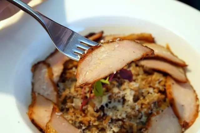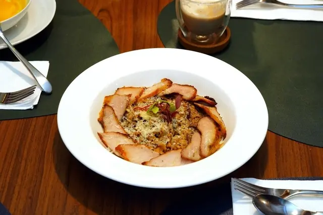 ▼松阪豬肉軟嫩多汁,米飯是粒粒分明的口感,略有嚼勁融合了牛肝菌十足的香氣,伴隨著若有似無的淡淡松露香氣,則增添了層次魅力,是一道非常美味的燉飯。