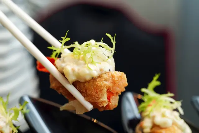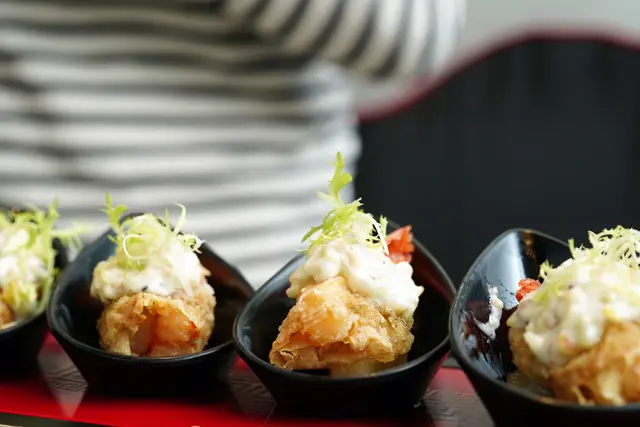 腐皮包裹明蝦,口感酥脆,明蝦球鮮甜彈牙,搭配鳳梨,酸甜可口~上面是混合水果丁等等的美乃滋沾醬,吃起來非常清爽。