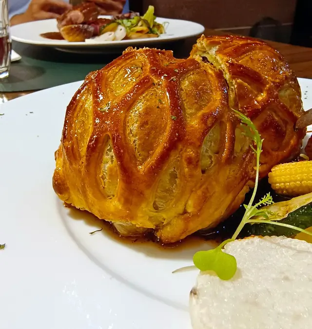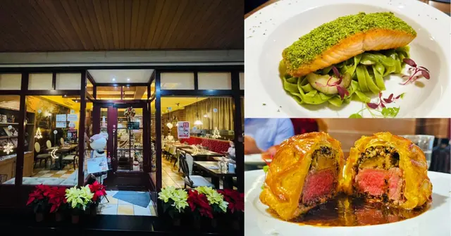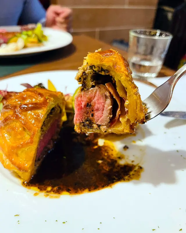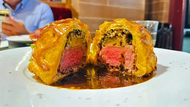 傳說是英國威靈頓公爵戰役凱旋歸來,御廚為了慶祝勝利,用酥皮包裹菲力牛排、鴨肝、松露等食材,讓公爵能一次享用最愛的食物,真的是非常頂級的享受呢!