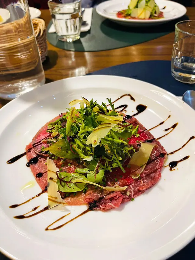 ▼最底層是生牛肉,生牛肉散發淡淡甜味,吃起來十分鮮美;生菜刨上幾片薄乳酪,味道鹹香迷人,淋上巴薩米克醋,優雅的醋酸味相當開胃