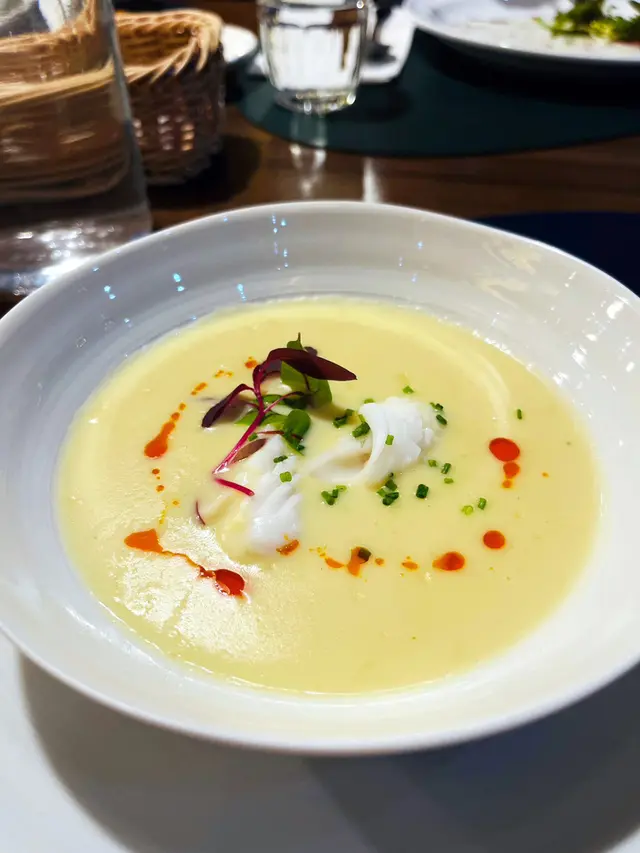▼蓮子製成的濃湯,喝起來滑順如馬鈴薯濃湯,但帶有蓮子的清香,整體口感更加輕盈。