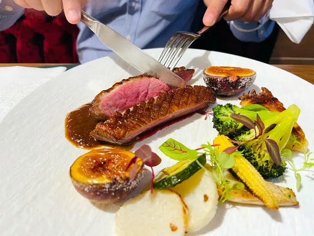 ▼讓人驚艷的無花果!上面是一層焦脆的焦糖,咬下來瞬間爆汁非常juicy,酸酸甜甜的汁液可以緩解肉食膩感,和舒肥櫻桃鴨胸特別match~香煎鴨胸皮香肉嫩又多汁,深得我哥的喜愛!