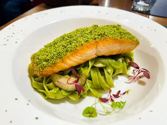 ▼烤鮭魚上面一層香料粉,由麵包粉/羅勒/百里香/西洋芹/帕馬起司製作而成,吃起來充滿香料風味~非常有歐洲異國風情