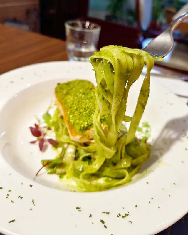 ▼麵體使用鳥巢寬麵,口感比義大利直麵更加Q彈、也可以吸附更多醬汁,每一口都是濃郁的羅勒醬汁,麵條很滑順地一口一口落入我媽的肚子中😆