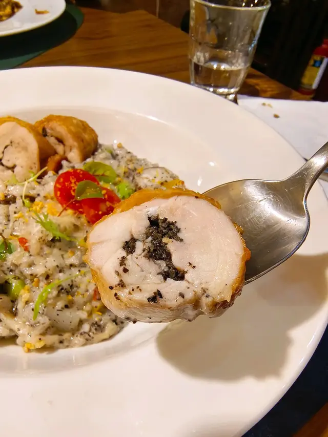 ▼雞肉捲中間是松露醬,經過煎烤,雞皮油香酥脆,裡面雞肉紮實多汁