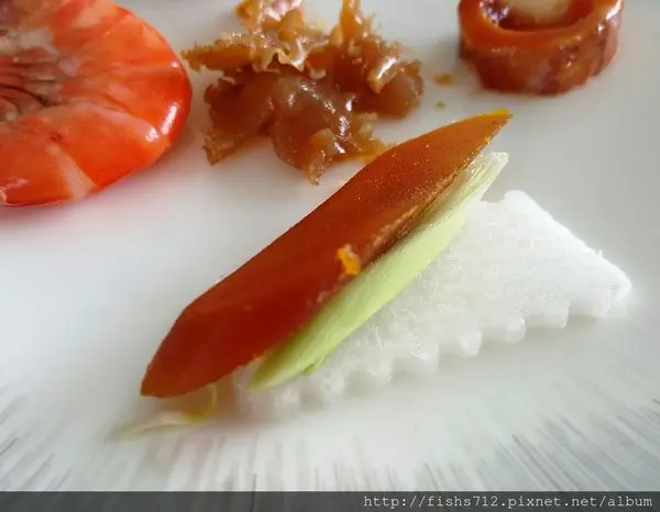 厚切的烏魚子搭配蒜苗蘿蔔片