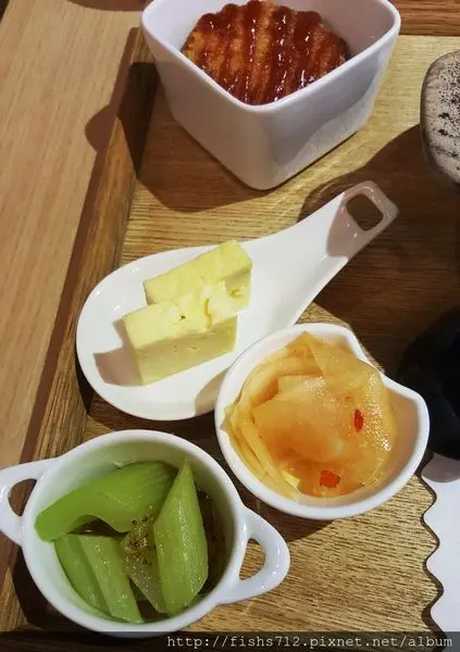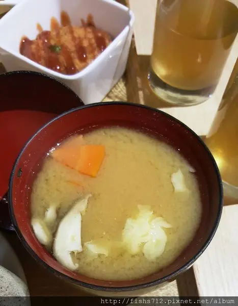 每份定食都有麥茶、玉子燒、時蔬、漬物、味增湯、甜點