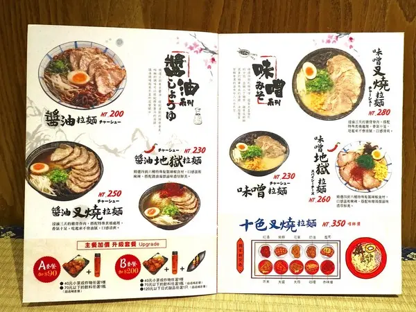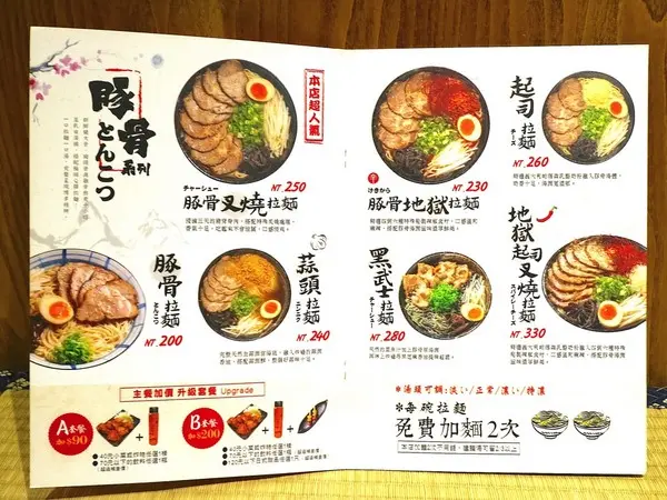 單點拉麵,也可選擇加價升級A/B套餐: