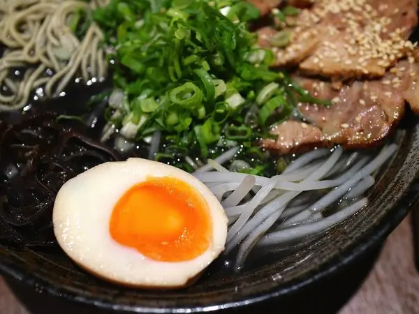 整份{黑武士拉麵}配料豐富:有4大片叉燒+大量豆芽菜+黑木耳絲+半熟蛋,還有一大把翠綠蔥花,視覺上澎湃吸睛!