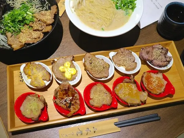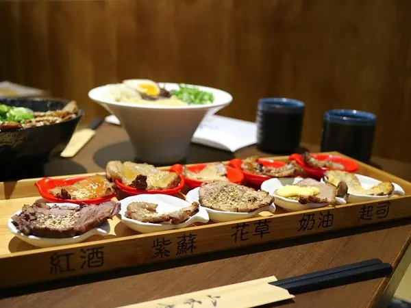 {十色叉燒拉麵}分別有:紅酒.紫蘇.花草.奶油.起司.芥末.大醬.大蒜.咖哩.赤味噌,十種口味的叉燒。