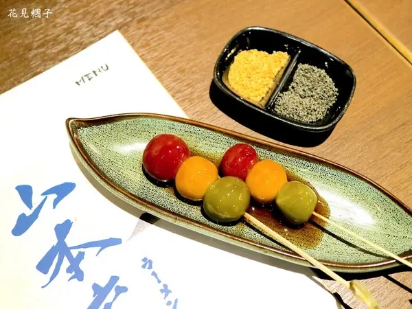 {花見糰子}為兩串日式團子,搭配花生&芝麻雙粉呈上。