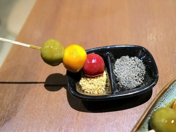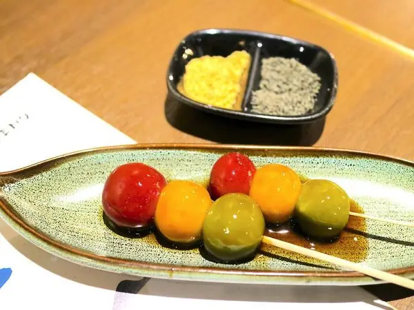 美美的三色糰子,用的可不是色素唷!紅、黃、綠色,分別是紅麴、黃薑、抹茶 三種口味的糰子!
