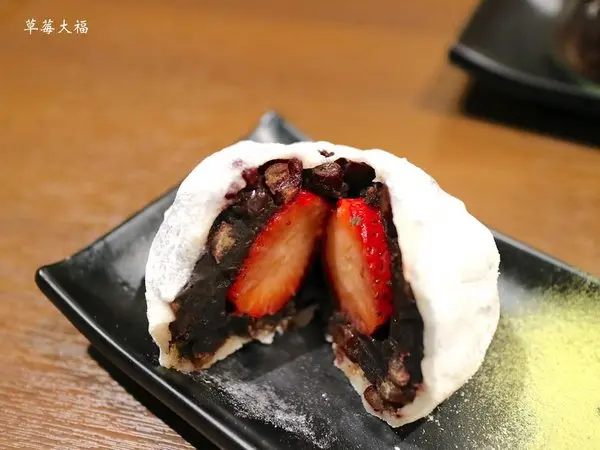 QQ的麻糬皮,包裹的是吃起來不甜膩的紅豆餡&整顆鮮紅草莓。草莓的酸甜,搭配微甜的軟綿紅豆餡,真的是100分!