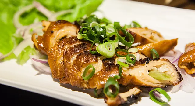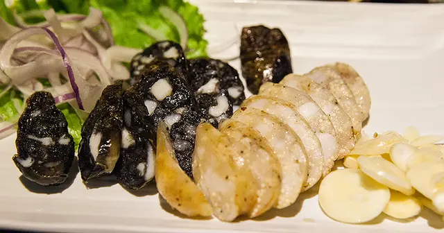 肥嫩的肥腸烤至表皮微焦,外面搭配蔥花及洋蔥,肥腸內部補以青蔥解膩,