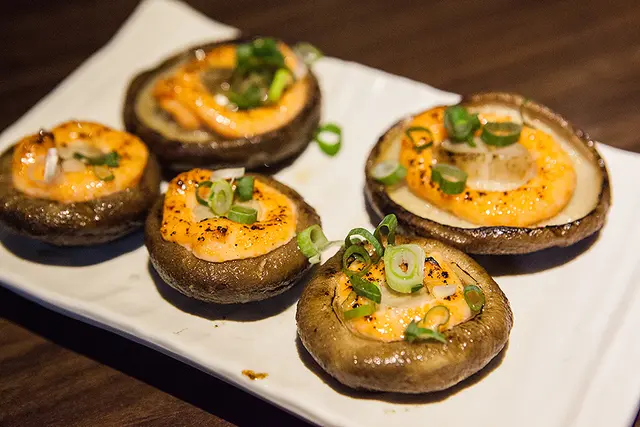 將明太子擠上剛烤好的香菇,一口咬下可以吃到明太子的顆粒甜味