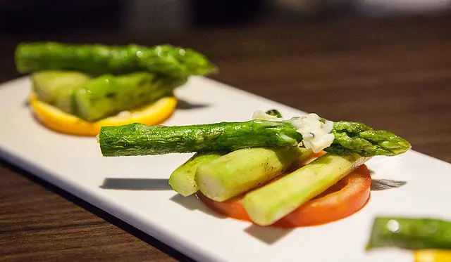 這道還蠻特別的,將烤好的綠竹筍切塊後疊在番茄或柳丁切片上