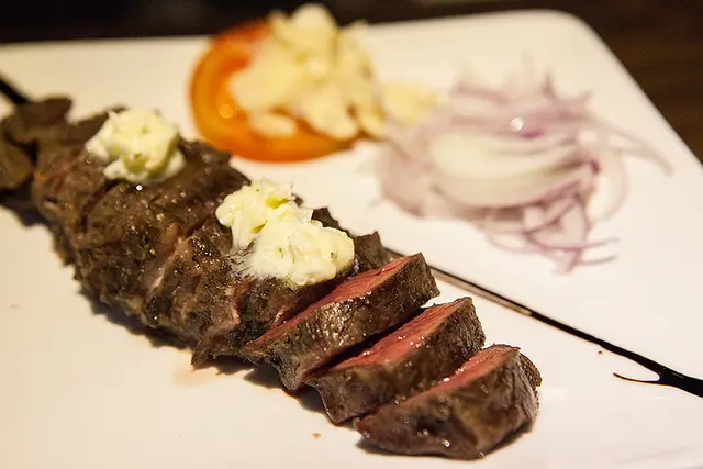 將牛小排烤至約八分熟的程度,吃起來就是很典型的烤牛肉串的口感,味道不錯