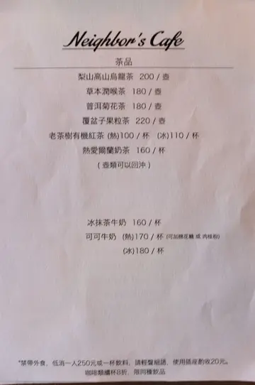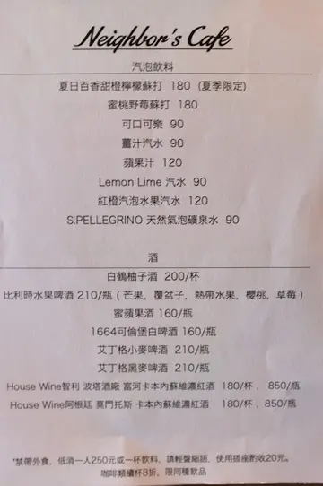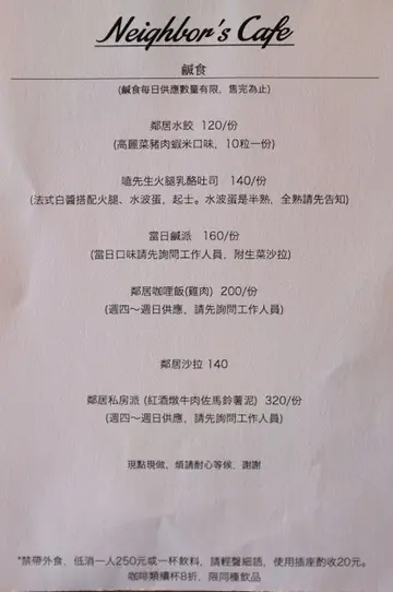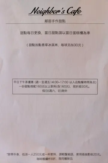 因為沒有事情要回家想說去永康街吃吃,但不知道要吃什麼也還好有好友斑比的提議之下,我們就來到了青田街上Neighbor's Cafe鄰居咖啡!因為我在永康街周遭晃阿晃的都不太晃到這邊以外,我發現這條街是我小時後補習的地方耶~原來這邊也可以把店面用的這麼有特色!當日已經是晚間五點,我們就是想來這邊吃飯喝茶加甜點!很喜歡門口保留這樣的痕跡,有種老舊的感覺!擺設也一些療癒系小物室內空間算寬敞舒適墨約有25~35個座位,想來的話也可以先訂位!這邊其實比較專門的是販售甜點及咖啡,鹹點的話也是會提供一兩種選項的!來這邊也可以看看雜誌放鬆一下甜點在前方都可以作選擇這邊的價格義式咖啡80元~180元、手沖單品咖啡150元~220元、TWG系列160元~320元、茶品100元~220元、氣泡飲料90元~160元、酒160元~850元(未成年請勿飲酒)、鄰居手作甜點60元~140元、鹹食120元~220元一~五14:00~17:00下午茶優惠-一份甜點搭配飲料(160元起)現折抵60元,假日除外!吧檯也是很明亮的坐位夏日百香甜橙檸檬蘇打 160元 (季節限定)裡頭的水果讓整體感覺非常的豐富,香甜且有一點檸檬酸味帶有氣泡的口感,非常適合我不愛喝咖啡的人來點用,其實不喝咖啡也可以來點其他的茶品來喝老茶樹有機紅茶 100元茶味很濃郁也蠻香的,不過可能我喝的茶也沒有太多種所以無法細細的感覺出哪裡有差異,只覺得還蠻順口的一個紅茶!鄰居咖哩飯 220元/份上來的時候驚覺也太豐富了吧!!!昨日才在別間店吃了不優秀的咖哩..只有無聊的冷丸子(有股味道)份量又少....,然後在回神看到這碗!!!!豪開心阿~心情大好~光用聞的就快流口水了,這間店的咖哩在永康街可以說是佼佼者~咖哩醬吃的到牛小排的味道且牛小排嫩口美味也蠻多塊的,馬鈴薯燉煮熟透外還有本身的香氣入口也感到綿密,紅蘿蔔吃起來香甜帶些咖哩香氣,整體來講這咖哩是我喜歡的不僅濃郁也很香,也大方的快埋住白飯了!咖啡戚風蛋糕 100元/塊 (當日口味請詢問工作人員)我不知道為什麼很喜歡很喜歡戚風蛋糕,不過當天沒有我的最愛伯爵口味的,所以其中巧克力與咖啡我就選擇了咖啡,咖啡在這戚風蛋糕中的味道不大明顯,吃起來是蛋奶香但細細品嘗吃的出來一些咖啡的氣息,口感鬆軟我蠻喜歡的更喜歡外表的烘烤香氣,是說鮮奶油有些太甜了我就不大沾來品嘗!真心覺得如果在永康街想要放鬆的下午茶我寧可走較遠一點的路程到這邊,私心已經再懷念這咖哩的味道,也想過來品嘗其他甜點LA~…查看更多